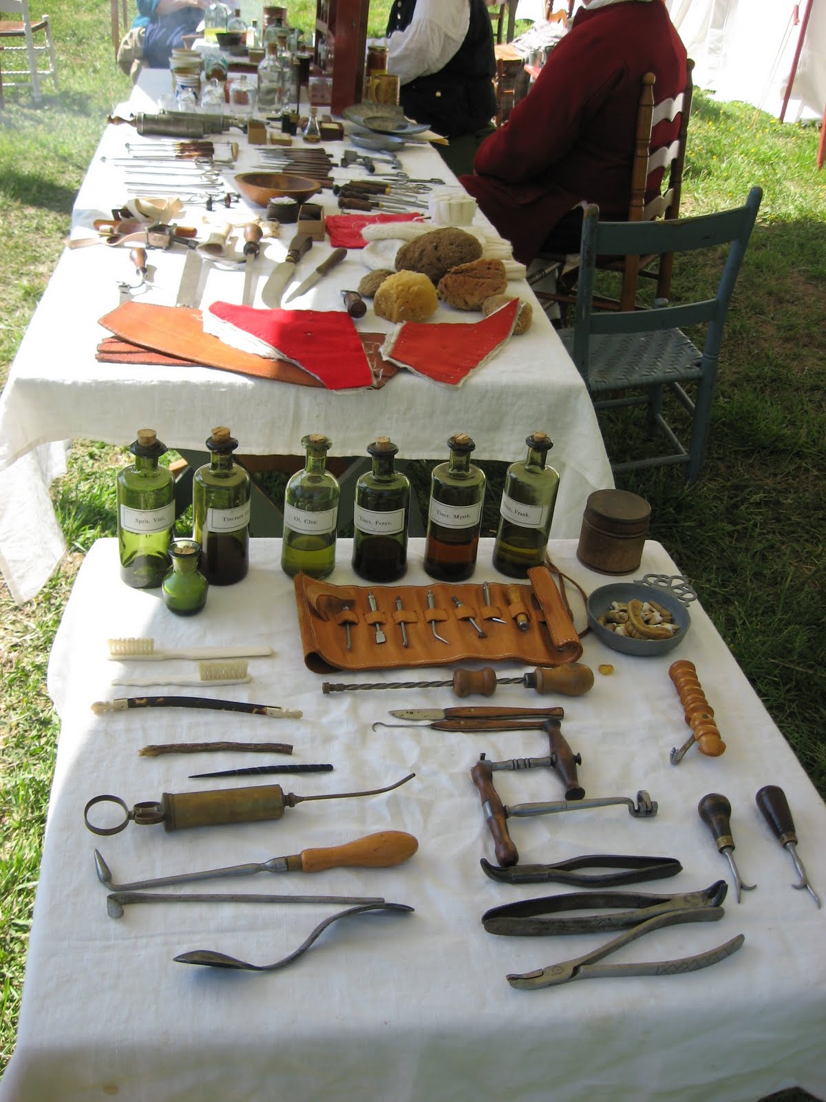 We just got back this evening from a lovely Rev War event at Battersea Plantation in Petersburg, VA. We unloaded and set up most of the canvas on Friday night, shared a bottle of claret, shot the breeze, and turned in for the night. We woke up to an unexpected but light (and thankfully brief) rainfall on Saturday morning. As we scrambled to get a fly up so we’d have a dry area to prepare breakfast, a half dozen AIT students came running over to help. I looked up and they were everywhere. Ft. Lee is a stone’s throw away, and it’s where the Quartermaster Schools are located. There were at least 30 there for the weekend providing support. This was a first – I’d never seen them at this site before, but it was great to have there. Some were Parachute Riggers, there were a couple of Dental Techs, and a slew that were training for Mortuary Services. Apparently the tools of the trade haven’t changed much in 225 years.