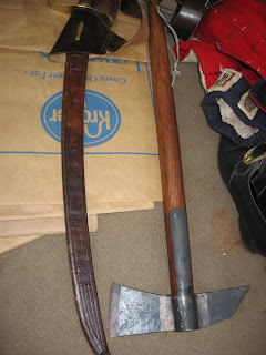 Oh look! Brown paper bags, a pair of buckle shoes, a coat with a decidedly miltary feel to it, a fairly long sword and boarding axe???