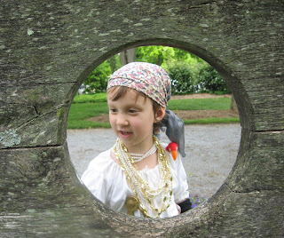 Held at Darnall's Chance in Upper Marlboro, MD, this was a fun thing to do with a 4 1/2-year-old. First she put her costume together, The only thing she wore today that she wears at events were her shoes. Ratty old shift? Check. Imported Indian calico headrag? Check. Ragged skirt AND fancy skirt? Check. Sword, hook, compass, spyglass and plenty of necklaces? Check, check, check, check and check. The most rightous piratical stockings ever? Aye, Matey!