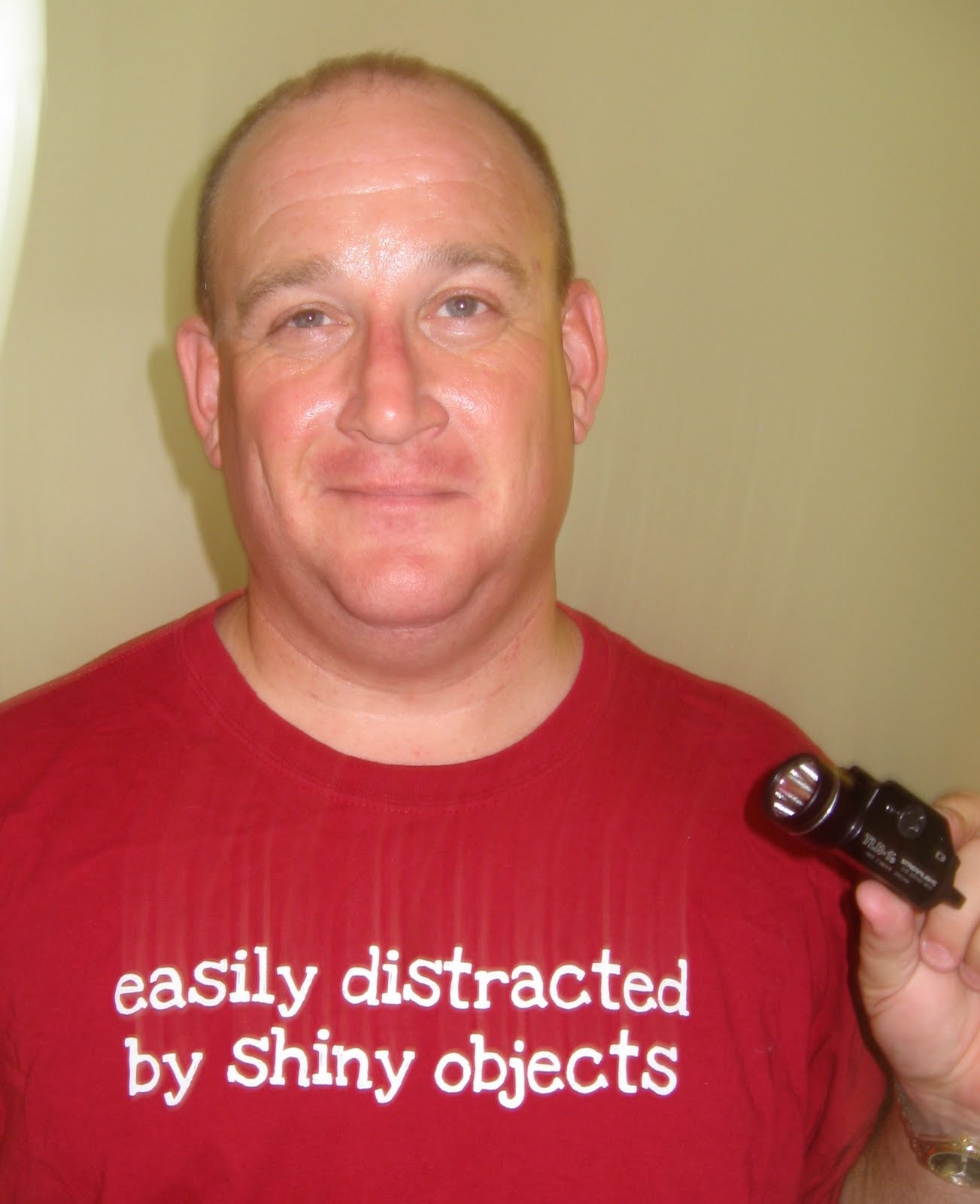 Well, today Sweet Daughter and I returned home after her swim class to find him opening the mail. He’d ordered a strobe-type flashlight for my pistol and was busy taking the thing out of the blister pack, putting the batteries in, and muttering some sort of stream-of-consciousness monologue about the lack of quality instructions, or lack of quality equipment, as it wasn’t working properly, when viola! A bright flashy light appeared in my peripheral vision, reflected in the hall mirror from where he was pointing it down the stairs.