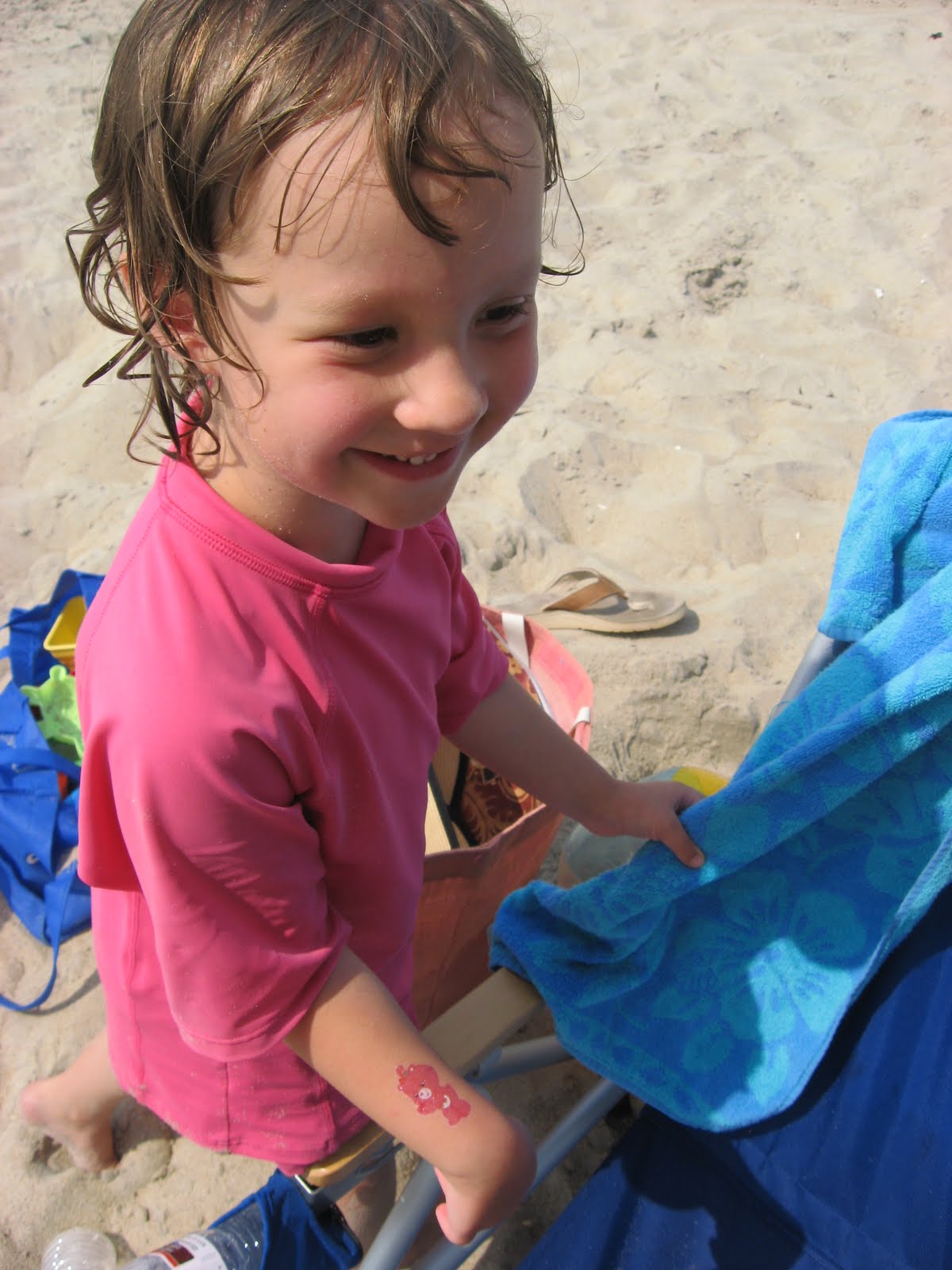 Sweet Daughter shows off her glitter Care Bear (temporary) tattoo.