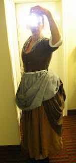 Now I've added my work gown with the back looped up a la polonaise, and a work apron that is tucked up behind. The ideal figure at this time was a cone, topped by an inverted cone. Or to look at it another way -- the bigger I make my hips look, the smaller my waist looks. I then take what looks like a giant 14" long tongue depressor called a busk, and slide it down the front of my stays to give me a nice straight front line. (Remember that cone shape.) The busk is one reason you see women in 18th century portraits sitting with their knees apart. Trust me on this.