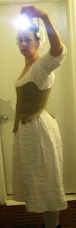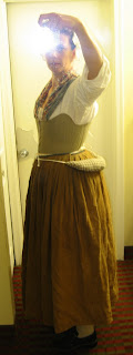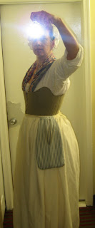 First layer, the one against the skin is the shift. Made of linen, it hangs down to about mid shin. Underneath the shift are stockings, garters and shoes. On top of the shift are the stays. The term "corset" isn't used until later. My stays are only partially boned, lace up the front and the back, and haven't been finished -- there isn't any binding around the edges yet. Which is good as I seem to have to keep taking them in. I've also put my hair up, and have covered it with a white linen cap.