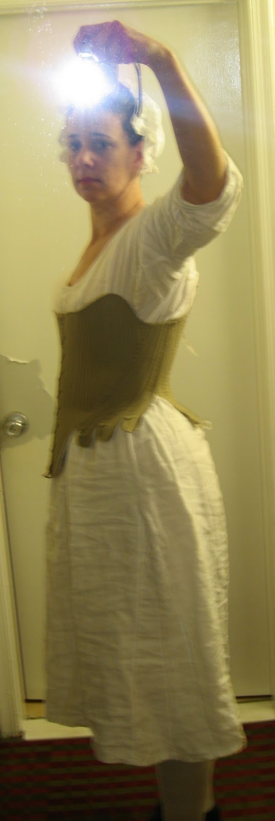 I thought I'd take advantage of the full-length mirror in my hotel room this weekend to show you the minimum of what I wear to 18th century events.