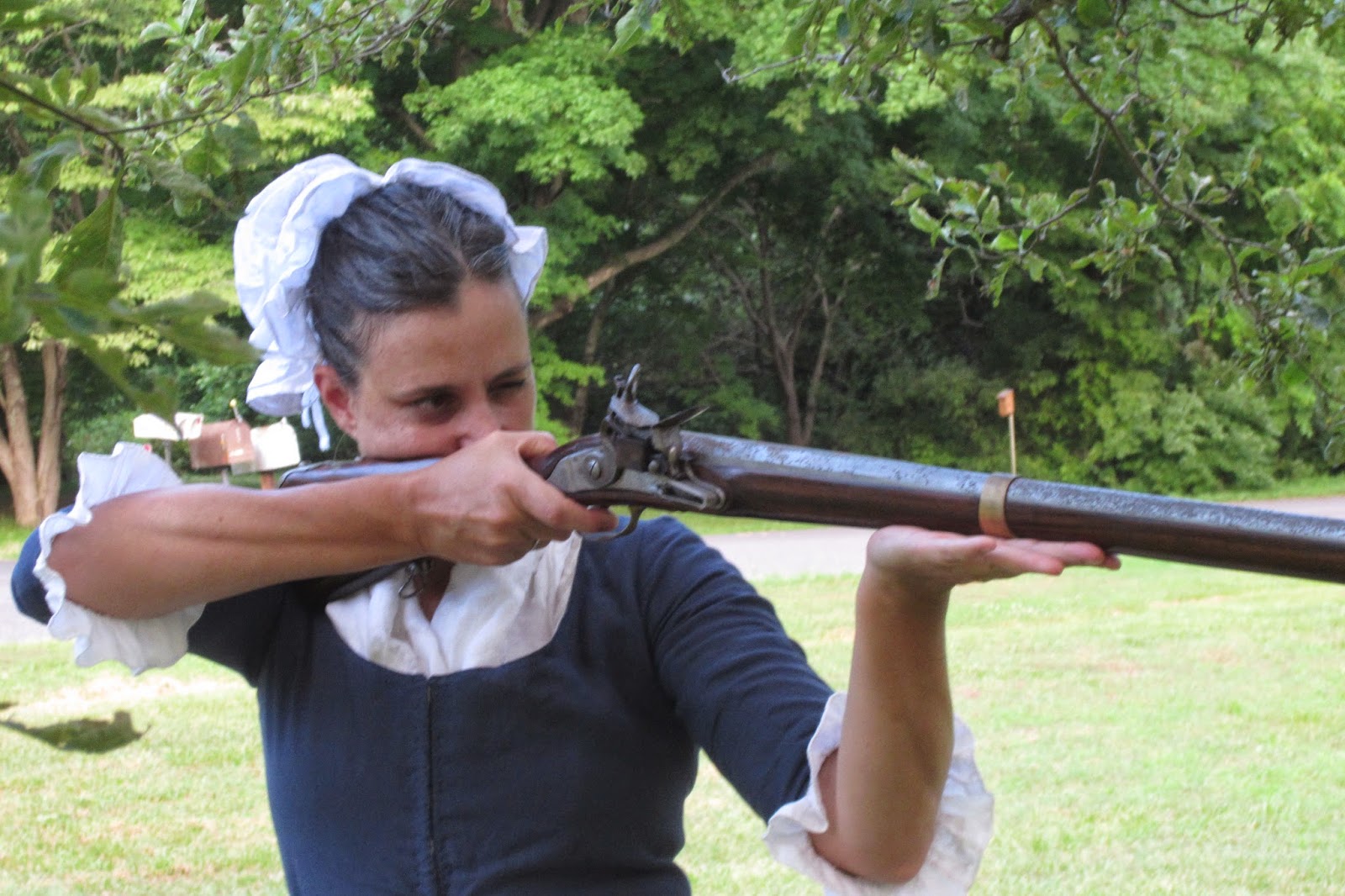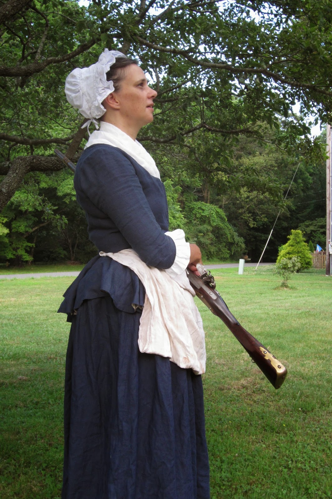 Here's the blue linen outfit fashioned from the maternity outfit. Here's it's worn without stays (shocking, I know). Plans are to wear this to the Firelock Match if I get there (long story). The first time I participated, I wore stays, and I ended up feeling like I had whiplash. My guess is that my torso remained pretty much immobile as a result, and my neck took up all the recoil.
